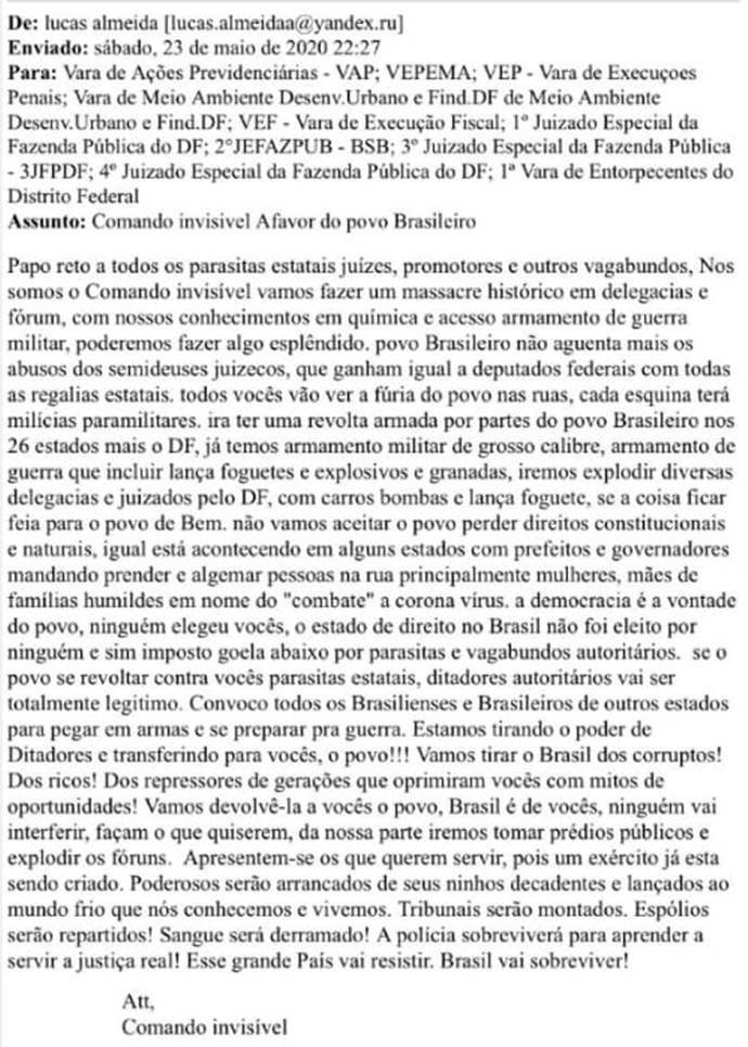 Quatro dias após a Polícia Civil prender dois homens que ameaçaram juízes do Tribunal de Justiça do Distrito Federal e dos Territórios (TJDFT), magistrados de dez varas receberam novas intimidações por e-mail. De acordo com o Metrópoles, a mensagem eletrônica foi recebida no último sábado (23), às 22h27. O texto saiu de um servidor de correio eletrônico hospedado na Rússia.