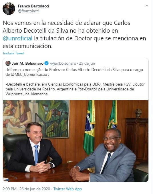 Reitor da Universidade de Rosário, na Argentina, Franco Bartolacci desmentiu nesta sexta-feira (26) o presidente Jair Bolsonaro (sem partido) a respeito da informação divulgada na última quinta (25) de que o novo ministro da Educação (MEC), Carlos Alberto Decotelli, é doutor pela instituição argentina.