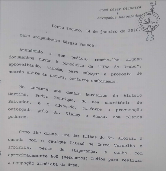 Na carta, enviada em janeiro de 2010, César aponta que uma das filhas de Aloísio era casada com o cacique Pataxó de Coroa Vermelha "e conta com aproximadamente 600 (seiscentos) índios para realizar a ocupação imediata da área".
