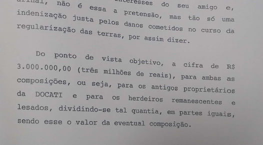 Foi então que os herdeiros de Aloísio, orientados pelo advogado César Oliveira, apresentaram uma carta de aforamento, datada de 1964, alegando serem os verdadeiros herdeiros da terra. Segundo o advogado Thiago Phileto, que representa Meeus, César teria encaminhado uma carta ao empresário Sérgio Pessoa, que possui relações com o belga, com uma proposta de acordo de R$ 3 milhões.