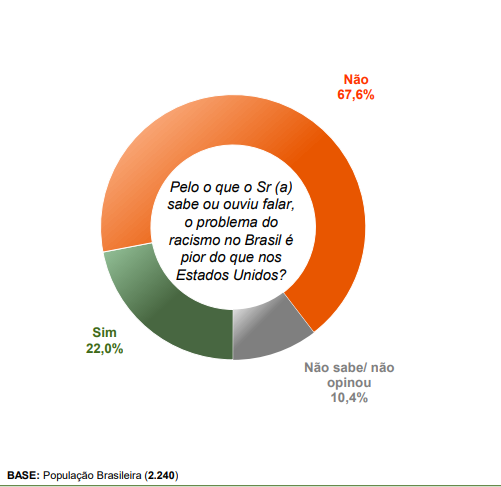 A consulta integra ainda um olha sobre a percepção dos brasileiros em relação às diferenças estruturais do racismo contra negros no Brasil e nos Estados Unidos. Neste aspecto, 67,6% das pessoas acreditam que nos EUA o problema do racismo é pior do que no Brasil. Apenas 22% dos entrevistados responderam positivamente à pergunta: “Pelo que o sr (a) sabe ou ouviu falar, o problema do Brasil é pior do que nos Estados Unidos?”.