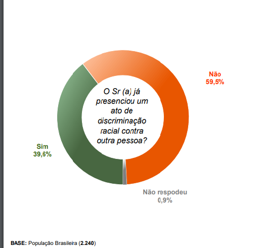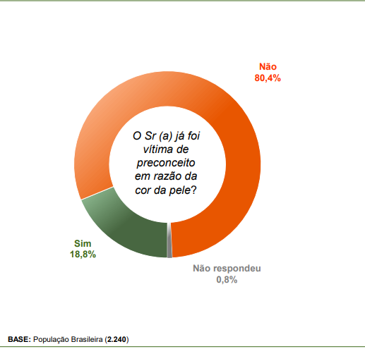 Dentre os entrevistados, 80,4% revelaram nunca ter sido vítima de preconceito em razão da cor. Outros 59,5% revelaram nunca terem presenciado atos de discriminação racial contra outra pessoa.