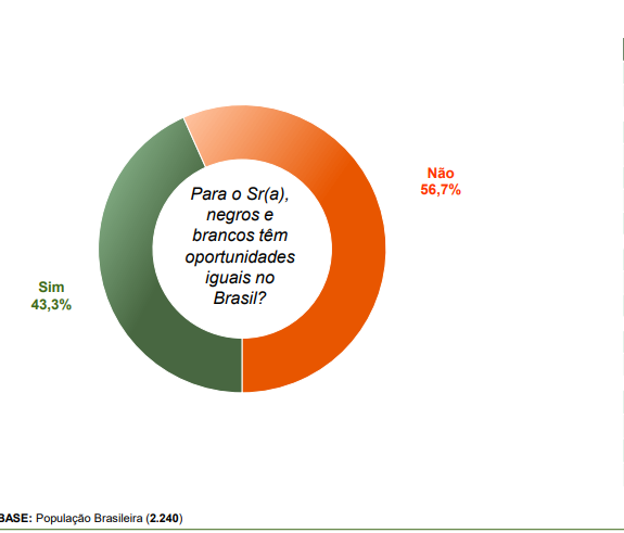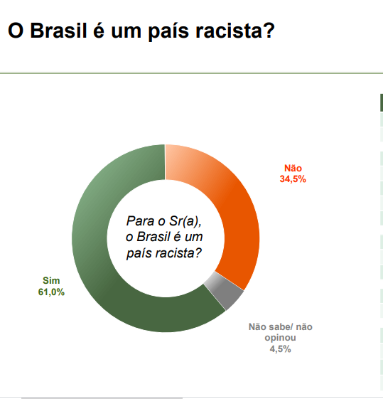 Para 61% dos brasileiros, o Brasil é um país racista. A conclusão é de uma pesquisa realizada pelo instituo Paraná Pesquisas, que ouviu 2,2 mil pessoas de 242 municípios brasileiros entre os dias 19 e 23 de junho. A pesquisa revela ainda que 56,7% dos ouvidos afirmam que negros e brancos não dispõem de oportunidades iguais no país.