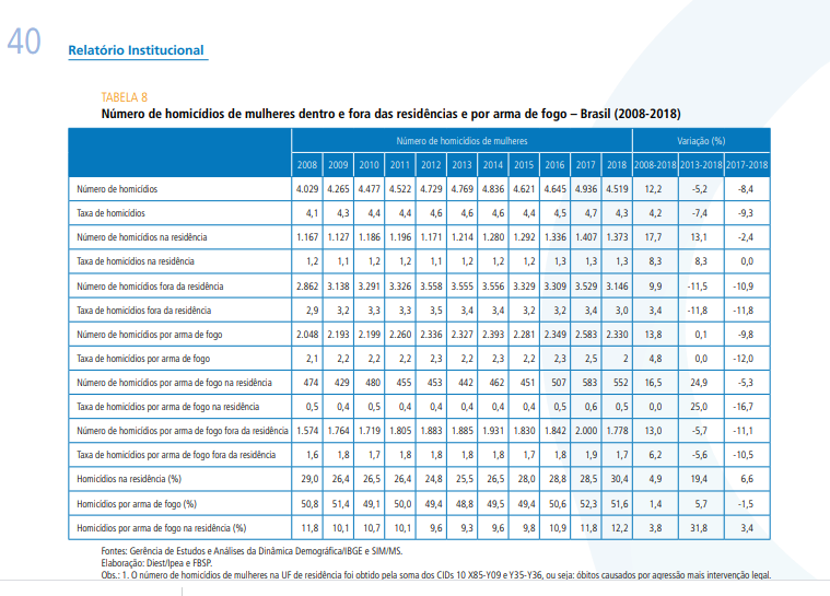 “Entre 2013 e 2018, ao mesmo tempo em que a taxa de homicídio de mulheres fora de casa diminuiu 11,5%, as mortes dentro de casa aumentaram 8,3%, o que é um indicativo do crescimento de feminicídios.