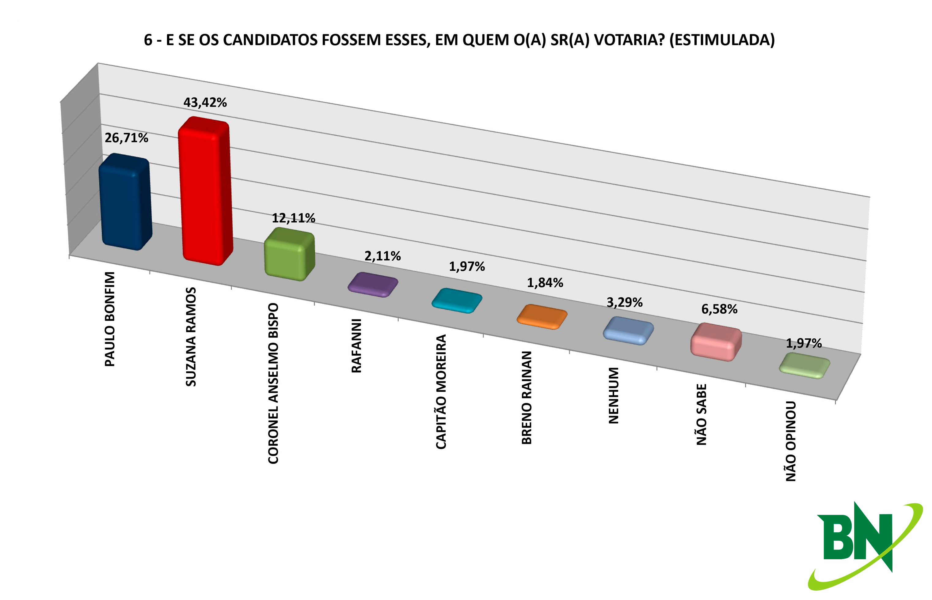No cenário estimulado, Suzana aparece novamente na frente com 43,42%. Paulo Bonfim aparece em seguida com 26,71%. A terceira posição fica com Coronel Anselmo (12,11%). Rafanni pontuou 2,11%, Capitão Moreira 1,97% e Breno Rainan 1,84%. Os demais eleitoes não souberam (6,58%), não opinaram (1,97%) e não escolheram nenhum 3,29%.
