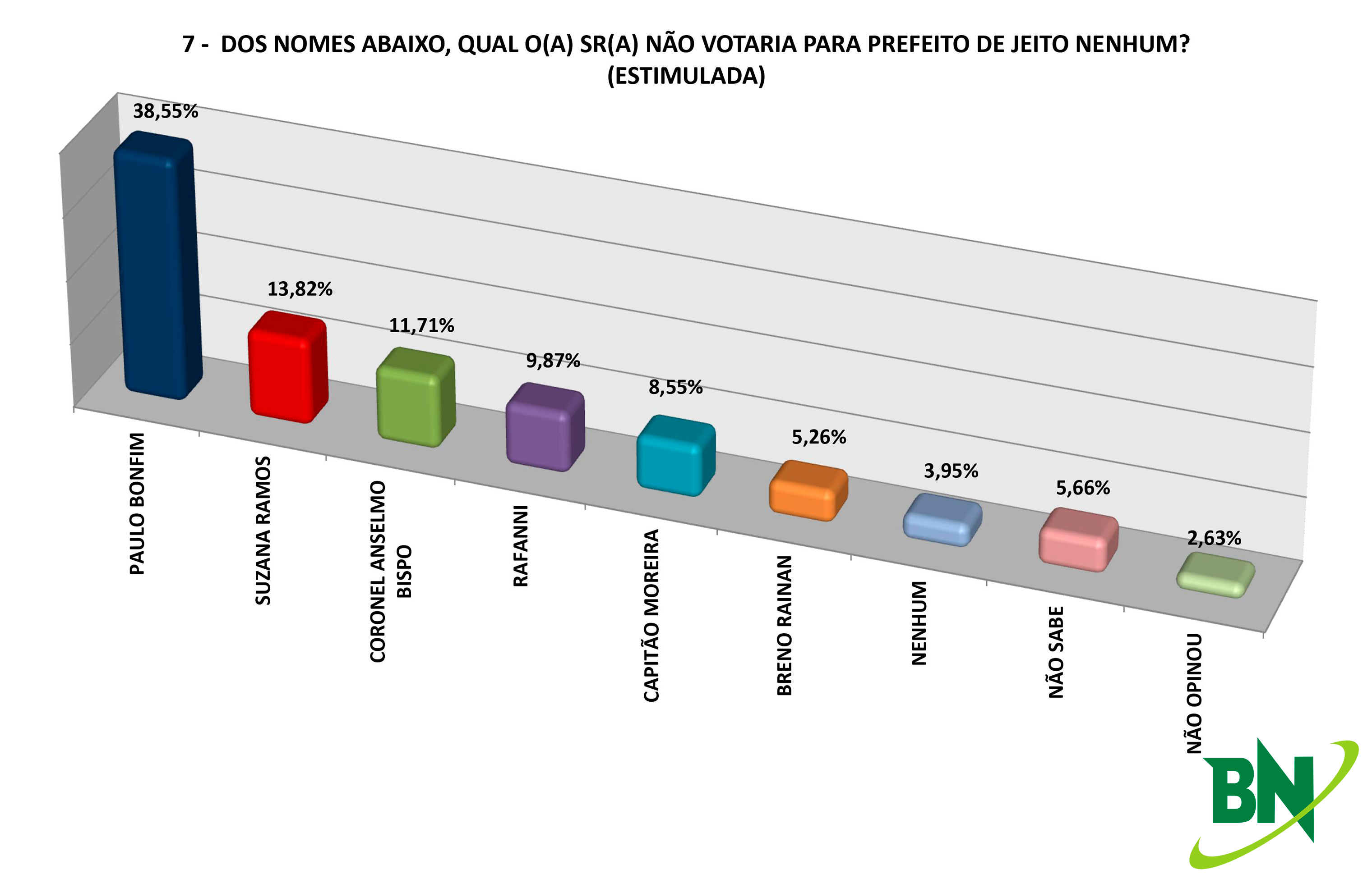 Paulo Bonfim foi o nome mais citado quando os eleitores de Juazeiro responderem em quem não votariam de jeito nenhum. O atual prefeito foi a resposta dada por 38,55%. Nesse cenário Suzana ficou com a segunda posição e 13,82%, Coronel Anselmo foi o nome seguinte com 11,71%. Rafanni teve 9,87%, Capitão Moreira 8,55% e Breno Rainan 5,26%. Os eleitres que não escolheram nenhum foram 3,95%, não souberam 5,66% e não opinaram 2,63%.