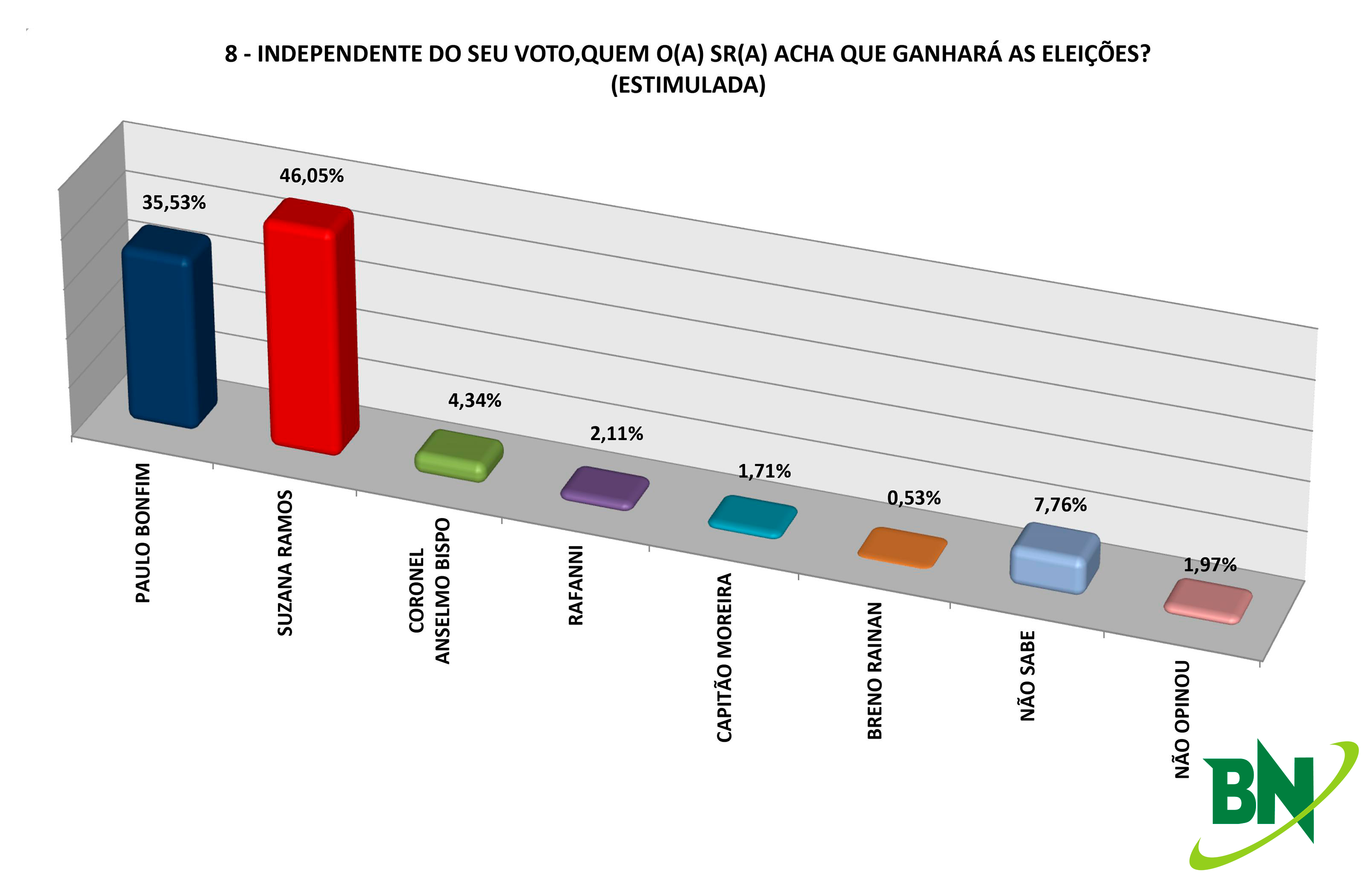 Os eleitores de Juazeiro ainda responderam quem eles acreditam que ganhará a eleição independente dos seus votos. Suzana aparece na dianteira com 46,05%, Paulo Bonfim em segundo com 35,53%, Coronel Anselmo teve 4,34%, Rafanni 2,11%, Capitão Moreira 1,71% e Breno Rainan 0,53%. Não souberam responder 7,76% e não opinaram 1,97%.