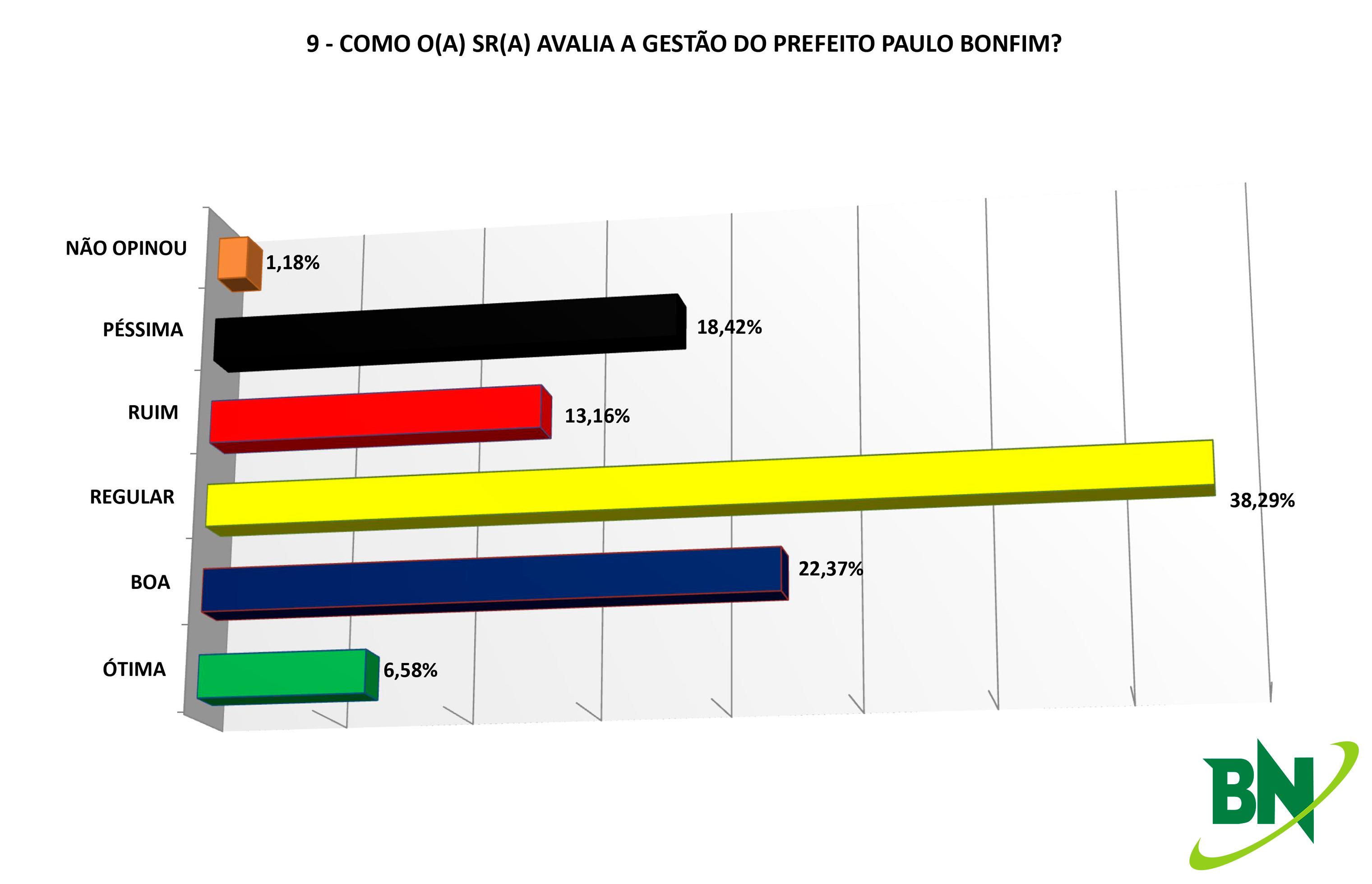 O levantamento BN/ Séculus também questionou os eleitores de Juazeiro sobre a acavaliação da gestão do prefeito Paulo Bonfim. A maior parte considera regular (38,29%). Os que acham "boa" são 22,37% e "ótima" 6,58%.