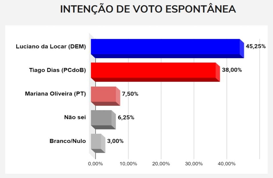 No cenário espontâneo, em que os eleitores respondem em quem votariam sem que sejam apontadas opções, Luciano soma 45,25% das intenções de voto. Tiago Dias é o segundo colocado com 38%. Mariana Oliveira soma 7,50%. Os eleitores que não souberam responder são 6,25%, e os que votariam branco ou nulo 3%.