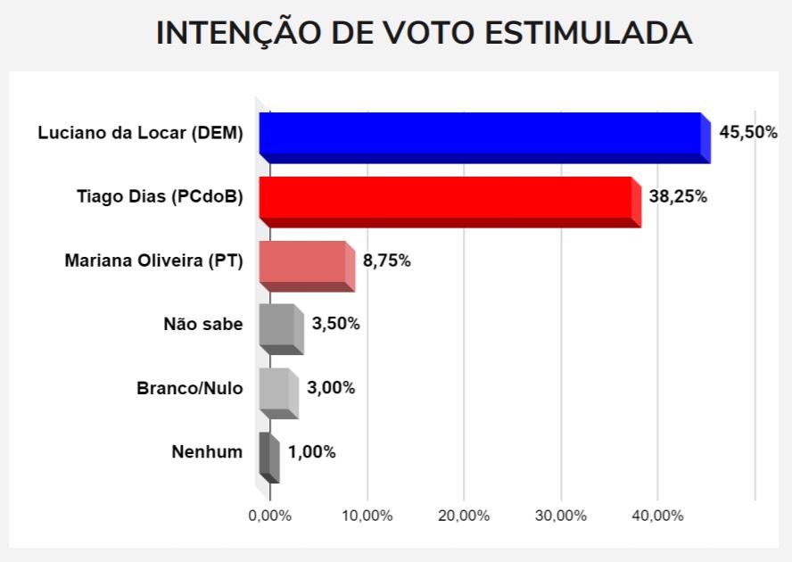 Luciano mantém a vantagem na pesquia estimulada, em que os eleitores apontam em quem votariam a partir de opções apresentadas pelo pesquisadores. O candidato soma 45,50% das intenções de voto para a prefeitura de Jacobina. Tiago Dias segue como segundo colocado com 38,25%. Mariana Oliveira soma 8,75%. Aqueles eleitores que não souberam representam 3,50%, votariam branco ou nulo 3% e não escolheriam nenhum 1%.