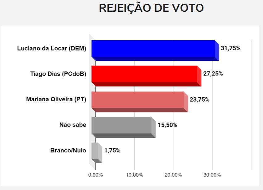 No cenário de rejeição, Luciado da Locar aparece com 31,75%. Tiago Dias 27,25% e Mariana Oliveira 23,75%. Não souberam responder 15,50% e optação por branco ou nulo 1,75%.