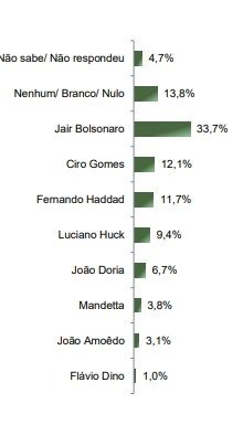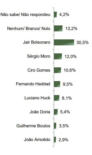 No cenário 1, Bolsonaro aparece com 30,5% das intenções enquanto Moro ocupa o segundo lugar com 12%. Ciro aparece na terceira posição com 10,6%. Pontuam ainda Fernando Haddad (9,5%), Luciano Huck (8,1%), João Doria (5,4%), Guilherme Boulos (3,5%) e João Amoedo (2,9%).