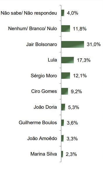 No segundo cenário, Bolsonaro repete a posição de vantagem e soma 31% das intenções de voto. O nome do ex-presidente Lula teve 17,3% e ficou em segundo lugar. Moro teve 12,1% e Ciro Gomes 9,2%.