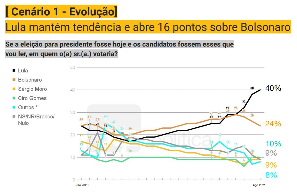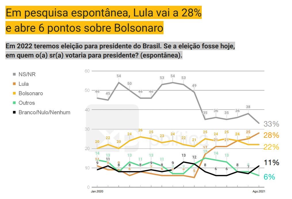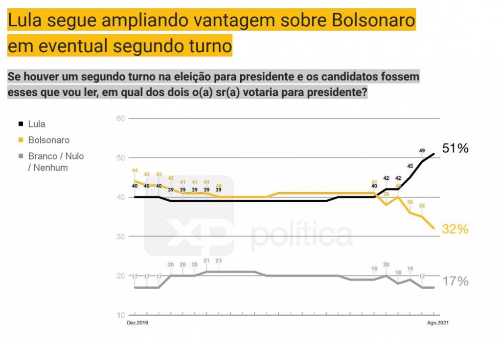 O ex-presidente Luiz Inácio Lula da Silva (PT) pôs 16 pontos de vantagem sobre o presidente Jair Bolsonaro (sem partido) na pesquisa XP/Ipespe divulgada nesta terça-feira (17). A diferença aumentou quatro pontos em relação ao último levantamento, veiculado em julho.