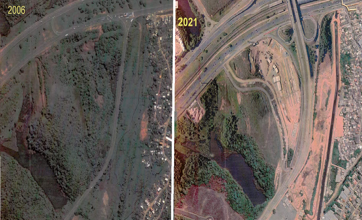 (a) Fotos aéreas antigas do terreno da Civil Construtora mostram o rio Jaguaribe serpenteando no terreno e com vegetação herbácea, arbustiva e arbórea na sua faixa de APP (veja aqui).