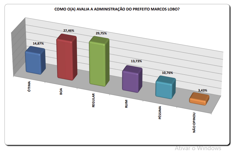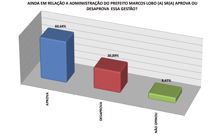 De todos os entrevistados que somavam idades dos 16 a 65 anos, 60,64% aprovaram a gestão do prefeito. Outros 30,89% disseram não aprovar a administração. 13,73% dos entrevistados consideraram a gestão de Lobo ruim. Péssima foram 10,76% dos entrevistados. Do total, 3,43% preferiram não opinar.