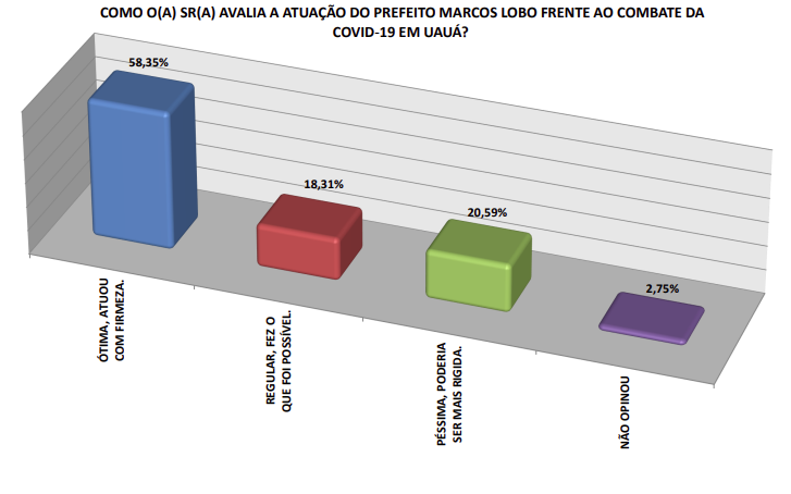 A pesquisa também perguntou aos moradores de Uauá qual avaliação eles faziam da gestão do prefeito diante do enfrentamento da pandemia da Covid-19. Na cidade, 58,35% dos entrevistados disseram que as decisões do prefeito podem ser consideradas ótimas. Já 20,59% consideraram que o gestor poderia ter adotado uma postura mais rígida no enfrentamento ao vírus.