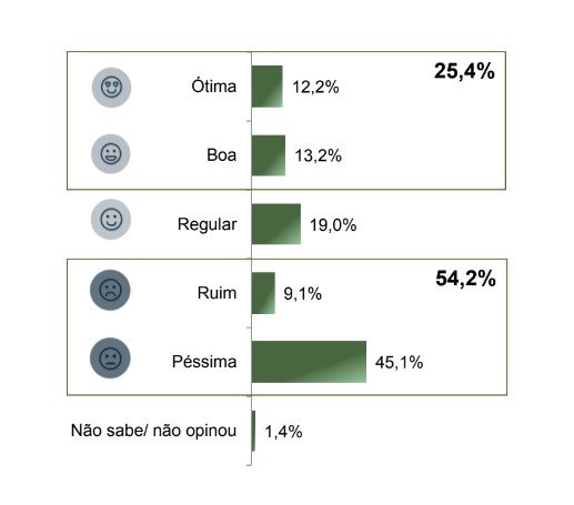 A gestão do chefe do Executivo é considerada "boa" por 13,2% dos baianos, enquanto 12,2% dos entrevistados a definem como "ótima". Outros 19% responderam que o governo de Bolsonaro é "regular".