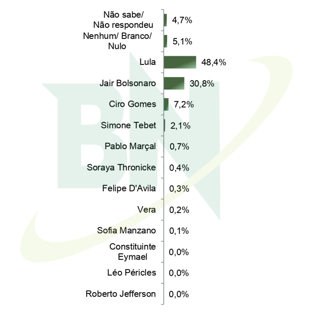Já na modalidade espontânea, Lula tem 40,6% e Bolsonaro 25,5%. Em terceiro lugar, Ciro Gomes (PDT), com 4,0%, seguido de Simone Tebet (MDB), com 0,9%. Pablo Marçal (Pros) aparece com 0,3%, Felipe D'Avila (Novo) 0,2% e Soraya Thronicke (União) 0,1%. Não souberam ou não responderam somaram 24,6% e aqueles que optaram pelo voto nulo, branco ou nenhum são 3,8%.