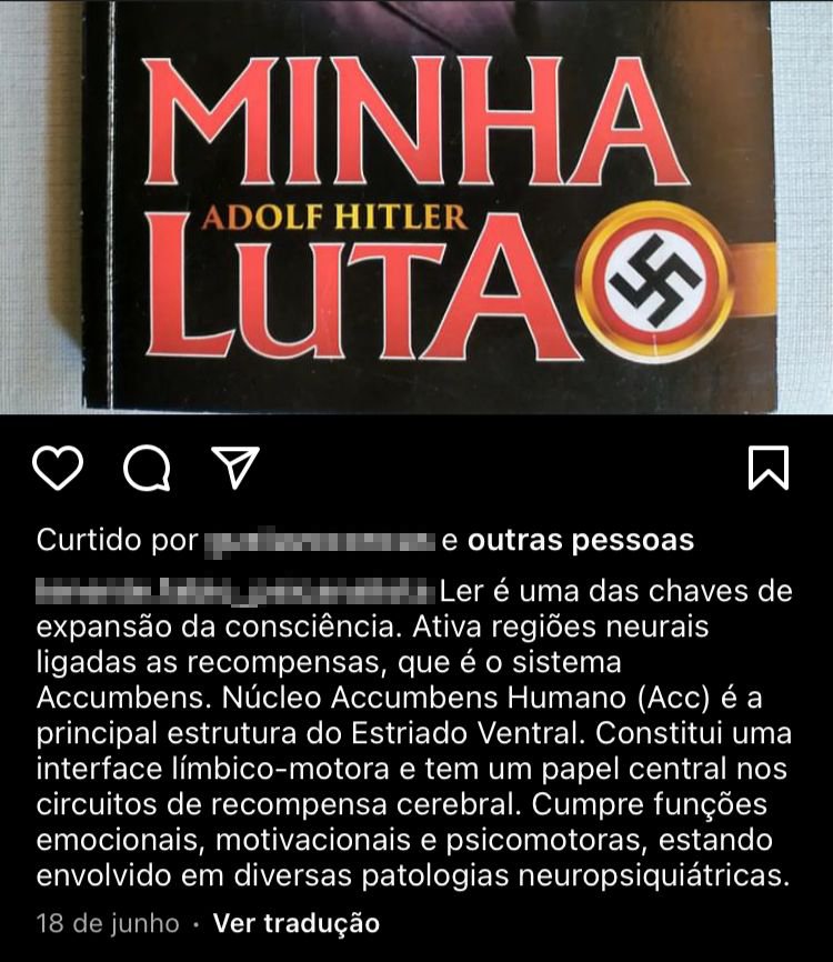 Com um perfil nas redes sociais em que se apresenta também como psicanalista, o tenente tinha uma publicação exaltando a necessidade de ler e escolheu “Minha Luta”, de Adolf Hitler, para ilustrar a postagem. No entanto, o pai do jovem desconversou sobre o tema: "Estou recebendo uma série de ameaças, por parte de pessoas que eu não conheço, falando que eu sou nazista, que eu que ensinei meu filho a atirar, que eu forneci as armas para ele cometer esse tipo de atentado”.