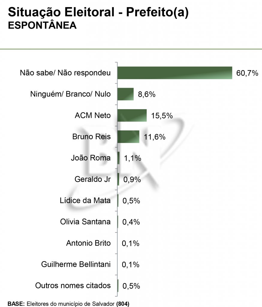 Quando não são apresentados os nomes, ACM Neto foi citado por 15,5% dos entrevistados, enquanto Bruno Reis foi lembrado por 11,6%. Aparece com mais de 1% apenas o ex-deputado federal João Roma (PL), que foi candidato a governador em 2022. Os demais nomes não atingem 1% das intenções de voto: Geraldo Jr. (MDB) é lembrado por 0,9%; Lídice da Mata (PSB) por 0,5%, Olívia Santana (PCdoB) por 0,4%; Antonio Brito (PSD) e Guilherme Bellintani (sem partido) por 0,1% cada um. Outros nomes somaram apenas 0,5%.