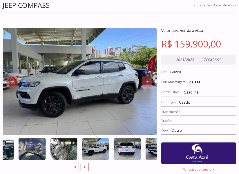 Entre as opções disponíveis em nosso site, está um JEEP COMPASS, cor branca, ano 2021/2022, na loja COSTA AZUL VEÍCULOS. Todas as informações de contato estão disponíveis na nossa plataforma.