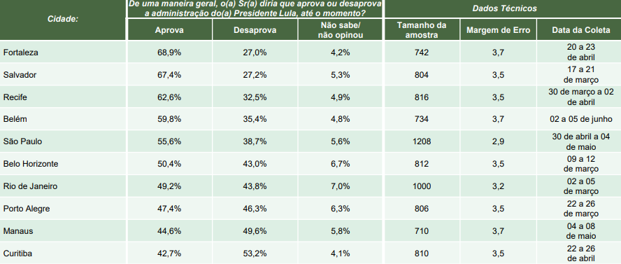 São Paulo foi a quinta capital onde Lula foi mais bem avaliado, com 55,6% de aprovação e margem de erro é de 2,9 pontos percentuais. A sequência tem Belo Horizonte e Rio de Janeiro aparecem logo em seguida, com 50,4% (margem de erro de 3,5 pp) e 49,2% (margem de erro de 3,2 pp ) respectivamente.