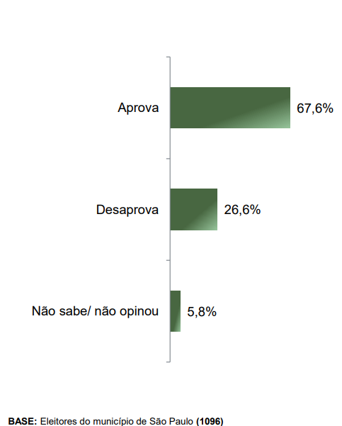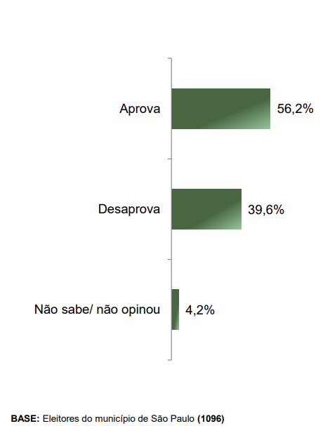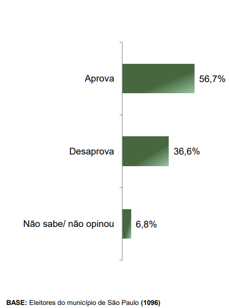 Entre os paulistanos ouvidos pelo levantamento, 35% avaliam a administração do prefeito como boa ou ótima, e 37,3% consideram regular. A gestão foi considerada ruim ou péssima por 24% dos eleitores. Não sabem ou não opinaram 3,6%.