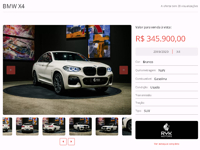 Entre as opções disponíveis em nosso site, está uma BMW X4, cor branca, ano 2019/2020, na loja Ryk Motors. Todas as informações de contato estão disponíveis na nossa plataforma.