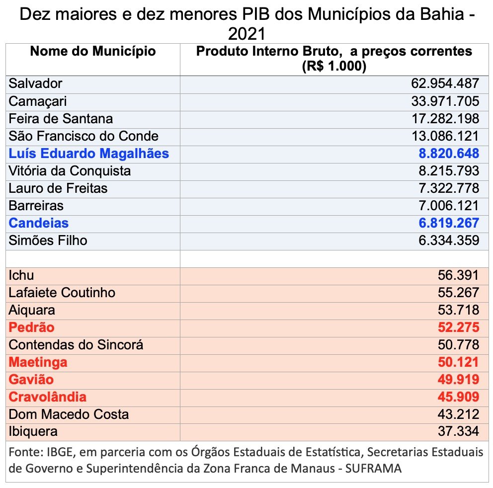 As três cidades que registram os maiores PIBs em 2021 já tinham alcançado a marca também em 2020.  Salvador e Camaçari ocupam posições desde o início da série histórica, em 2002. Já Feira ocupa a posição desde 2004. Segundo publicação do Acorda Cidade, parceiro do Bahia Notíciais, a cidade de Luís Eduardo Magalhães teve uma crescente na lista e registrou o 5º maior PIB da Bahia com R$ 8,820 bilhões e ultrapassou Vitória da Conquista, que ficou na 6ª posição pela primeira vez desde 2010 (R$ 8,208 bilhões).
