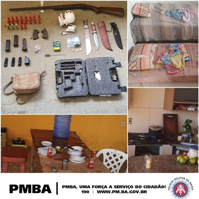 Policiais militares, durante buscas para a captura do soldado que fugiu do Batalhão da Polícia Militar, localizado na cidade de Lauro de Freitas, na manhã de quinta-feira (27), realizou, nesta madrugada (29), uma apreensão de armas de fogo e materiais ilícitos em um sítio, localizado na Estrada do Carro Quebrado, zona rural de Feira de Santana.