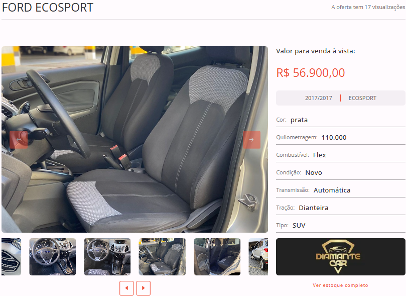 Entre as opções disponíveis em nosso site, está um FORD ECOSPORT, cor Prata, ano 2017/2017, na loja Diamante Car. Todas as informações de contato estão disponíveis na nossa plataforma.