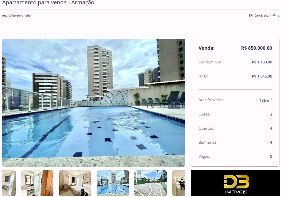Um dos imóveis disponíveis é um apartamento de 136 m² em Armação. O imóvel conta com 4 quartos, sendo 3 suítes, 4 banheiros e 136 m². Além disso, conta com 3 vagas de garagem, armários, varanda, condomínio com academia, salão de festas climatizado, brinquedoteca, piscina e entre outros.