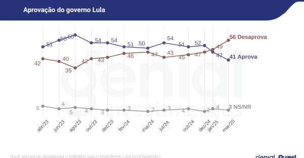 O levantamento, que ouviu 2.004 pessoas entre os dias 10 e 14 de julho, em 120 municípios, mostra uma recuperação tímida da imagem do presidente, após o desgaste provocado pelo escândalo no INSS no fim de maio. Na época, a reprovação alcançou o pior índice do mandato.