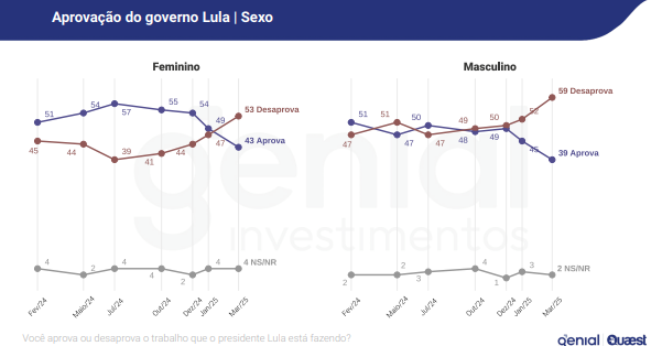 A pesquisa também mostra os grupos onde Lula enfrenta maior resistência: homens (58% de desaprovação), evangélicos (69%), bolsonaristas (94%) e pessoas com ensino médio completo (62%).
