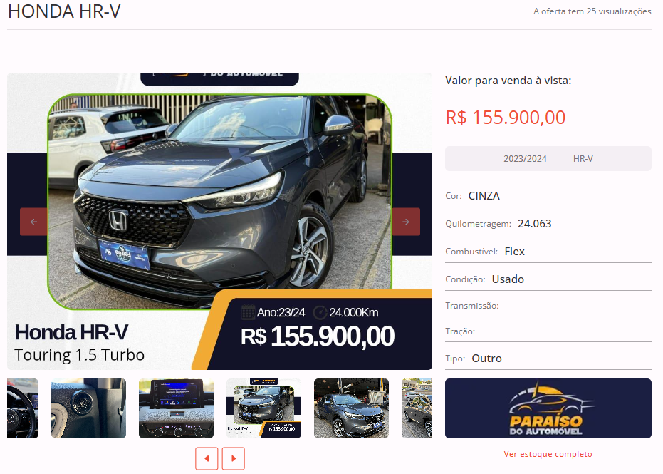 Entre as opções disponíveis em nosso site, está um HONDA HR-V, cor cinza, ano 2023/2024, na loja Paraíso do Automóvel. Todas as informações de contato estão disponíveis na nossa plataforma.
