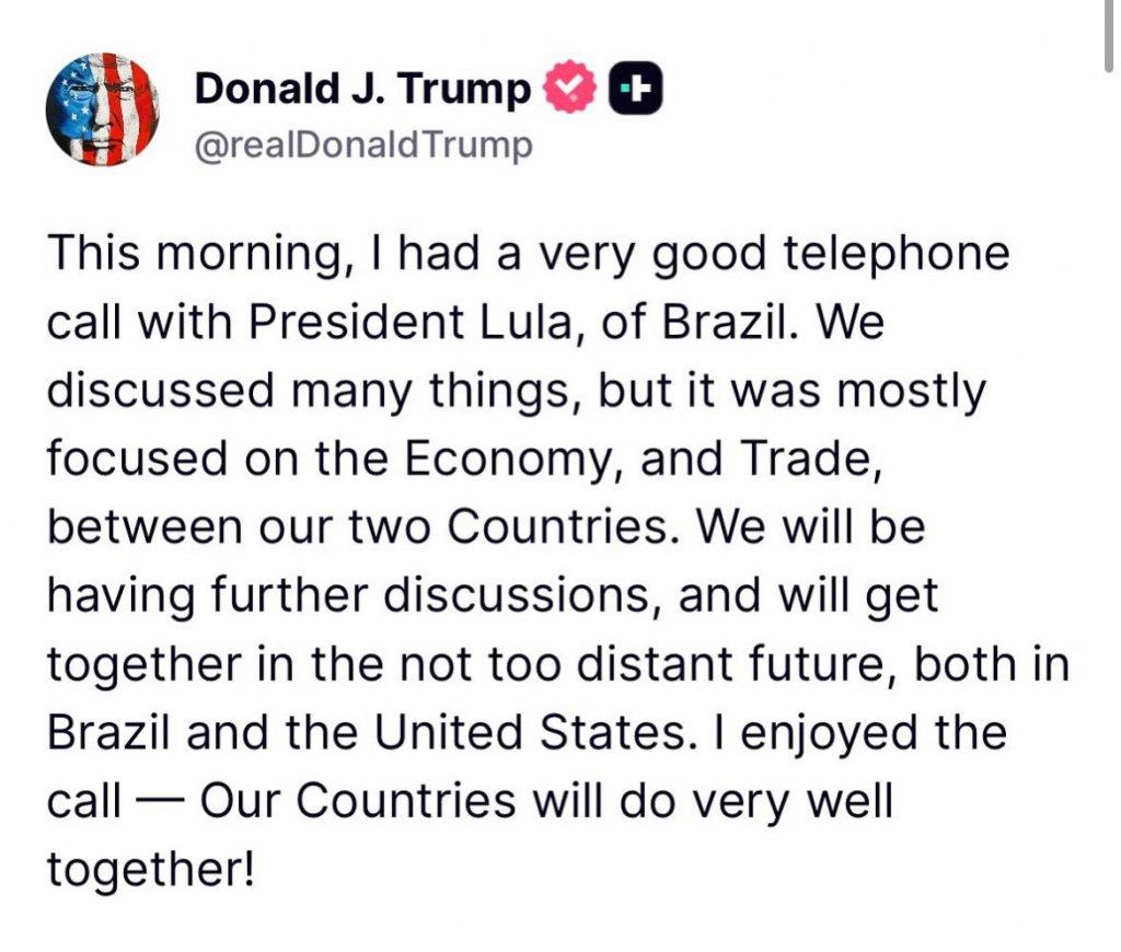“Esta manhã, tive uma boa conversa por telefone com o presidente Lula, do Brasil. Discutimos muitas coisas, mas principalmente a economia e as trocas entre nossos países”, escreveu Trump na rede social Truth Social.