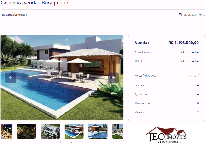 O BN Imóveis é a plataforma do Bahia Notícias voltada para a compra, venda e aluguel de imóveis. Entre os imóveis disponíveis está um apartamento de 200 m² em Buraquinho. O imóvel conta com 4 quartos, sendo 4 suítes, 6 banheiros e 2 vagas de garagem coberta. Além disso, o imóvel possui sala e cozinha amplas, armários planejados, espaço gourmet, suítes, churrasqueira, deck de madeira e entre outros.