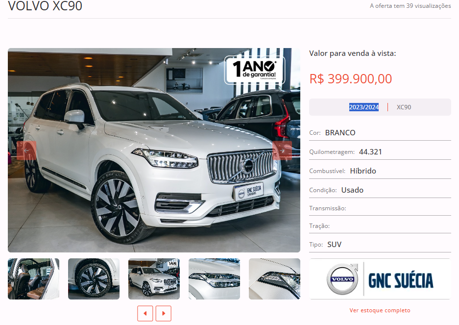 Entre as opções disponíveis em nosso site, está um VOLVO XC90, cor branca, ano 2023/2024, na loja Volvo Cars GNC Suécia. Todas as informações de contato estão disponíveis na nossa plataforma.