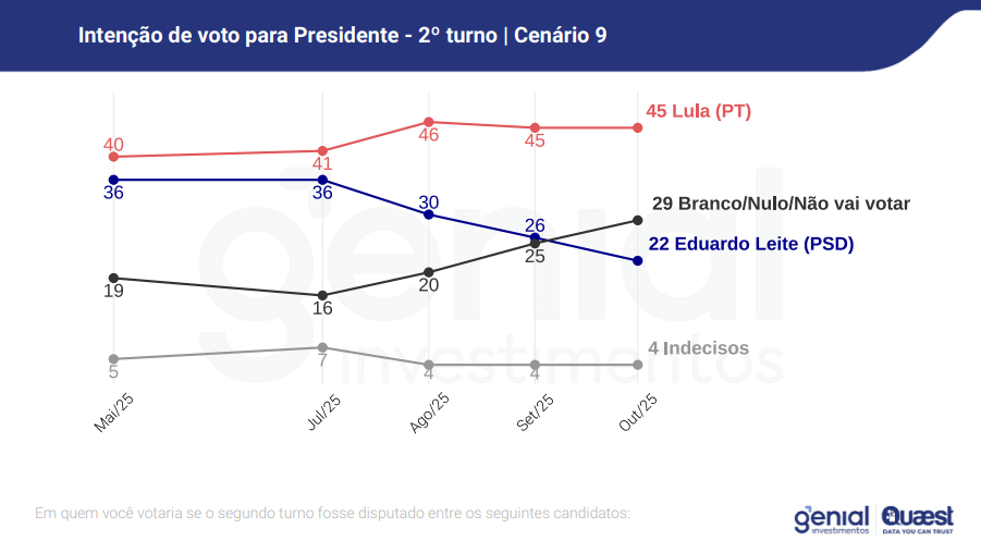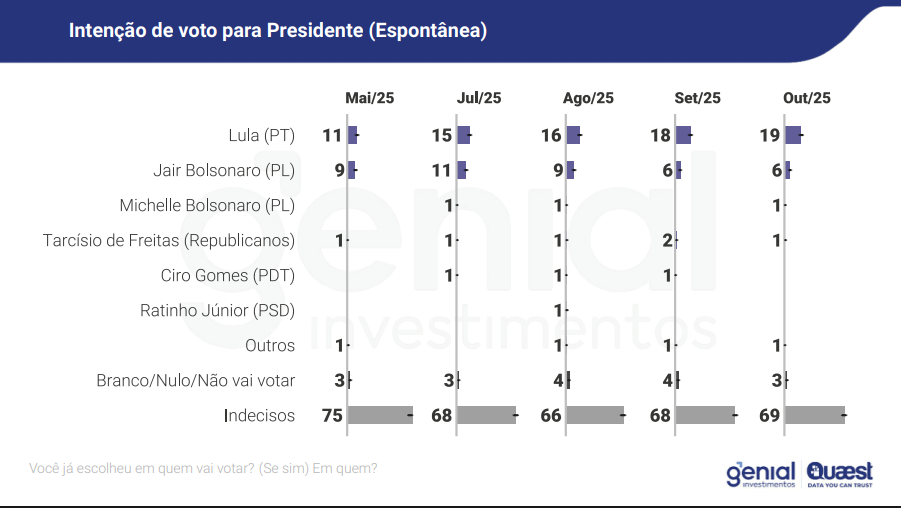 A pesquisa Genial/Quaest ouviu 2.004 brasileiros com 16 anos ou mais entre os dias 2 e 5 de outubro, de forma presencial. A margem de erro é de dois pontos percentuais e o nível de confiança é de 95%.