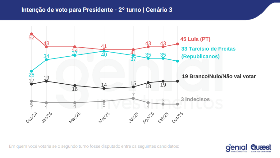 No entanto, o quadro mudou. A nova pesquisa mostra Lula com 45% das intenções de voto contra 33% de Tarcísio, ampliando a vantagem para 12 pontos percentuais, a maior registrada desde o início do ano. O presidente oscilou positivamente dentro da margem de erro de dois pontos, enquanto o governador caiu no mesmo patamar. Outros 19% declararam voto branco ou nulo e 3% estão indecisos.