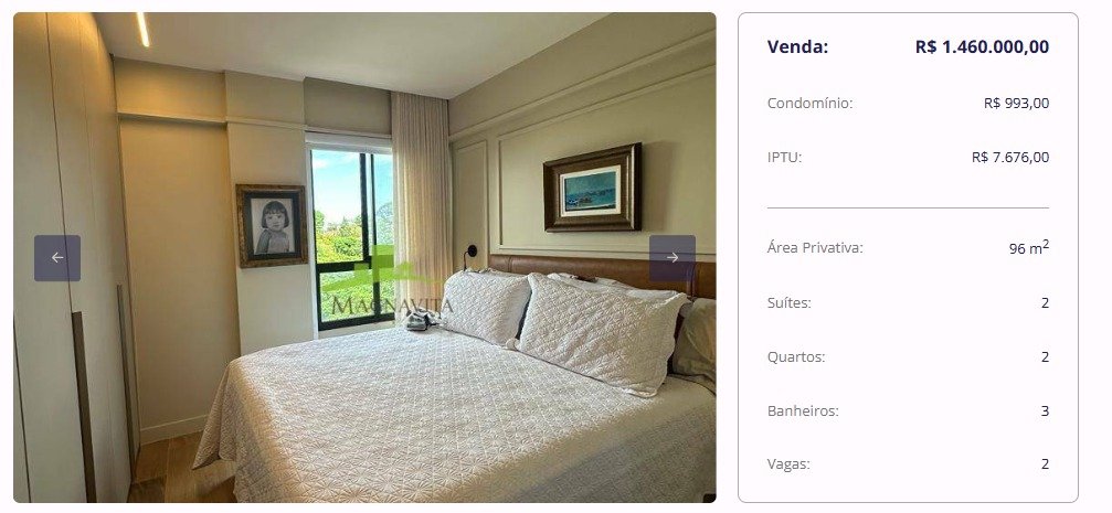 Um dos imóveis disponíveis é um apartamento de 96 m² no Horto Florestal. O imóvel conta com 2 quartos, sendo 2 suítes, 3 banheiros e 2 vagas na garagem. Além disso, o condomínio conta com piscina, academia, mini quadra, salão de festas e jogos, entre outros.