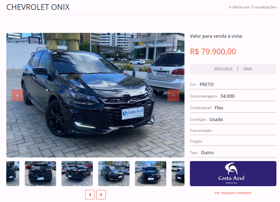 Entre as opções disponíveis em nosso site, está um CHEVROLET ONIX, cor preta, ano 2022/2023, na loja Costa Azul Veículos. Todas as informações de contato estão disponíveis na nossa plataforma.