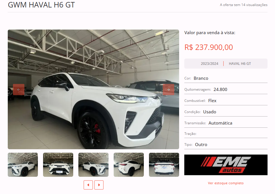 Entre as opções disponíveis em nosso site, está um GWM HAVAL H6 GT, cor Branco, ano 2023/2024, na loja EME Autos Seminovos. Todas as informações de contato estão disponíveis na nossa plataforma.