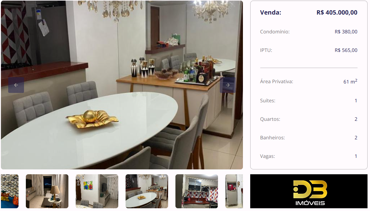 Um dos imóveis disponíveis é um apartamento de 61 m² em Brotas. O imóvel conta com 61 m² de área útil, 2 quartos (sendo 1 suíte), andar alto, nascente total e vista privilegiada para o Shopping Bela Vista. Possui varanda com reiki e tela de proteção, além de armários planejados em todos os cômodos. O condomínio oferece academia, piscina, salão de festas e segurança 24h. Conta ainda com 1 vaga de garagem.