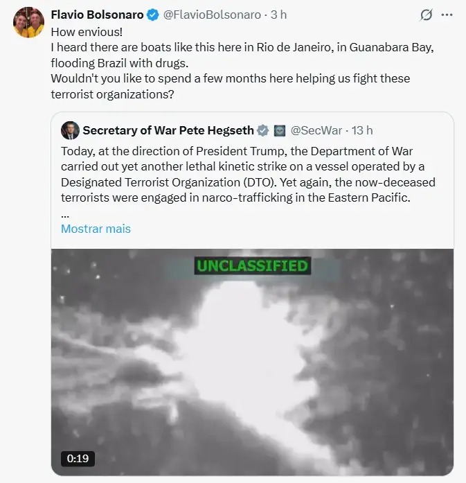 A postagem do parlamentar brasileiro ocorre em meio ao aumento das operações do governo americano contra embarcações suspeitas de tráfico de drogas no Oceano Pacífico e no Mar do Caribe, próximo à Venezuela.