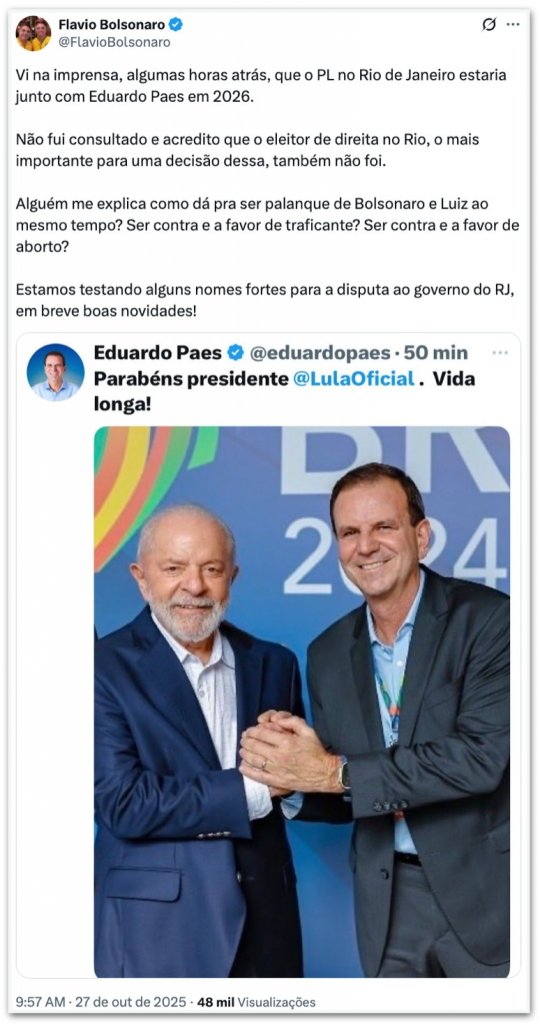 “Não fui consultado e acredito que o eleitor de direita no Rio, o mais importante para uma decisão dessa, também não foi. Alguém me explica como dá pra ser palanque de Bolsonaro e de Lula ao mesmo tempo? Ser contra e a favor de traficante? Ser contra e a favor de aborto? Estamos testando alguns nomes fortes para a disputa ao governo do RJ”, escreveu o senador na rede social X, antigo Twitter.