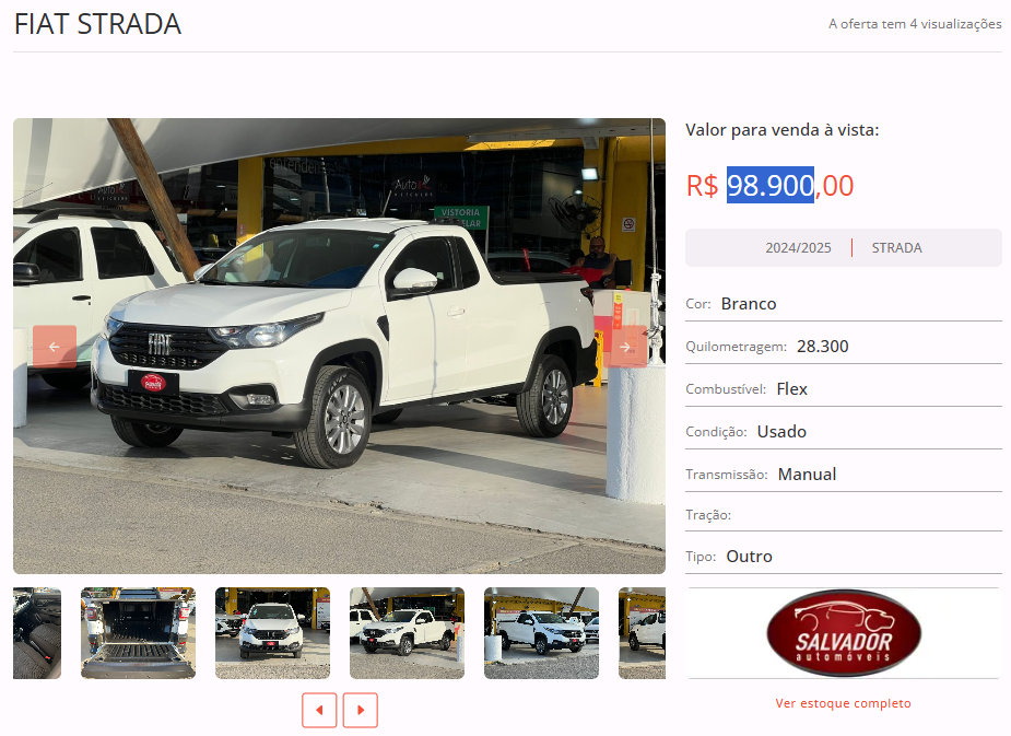 Entre as opções disponíveis em nosso site, está um FIAT STRADA, cor branca, ano 2024/2025, na loja Salvador Automóveis. Todas as informações de contato estão disponíveis na nossa plataforma.