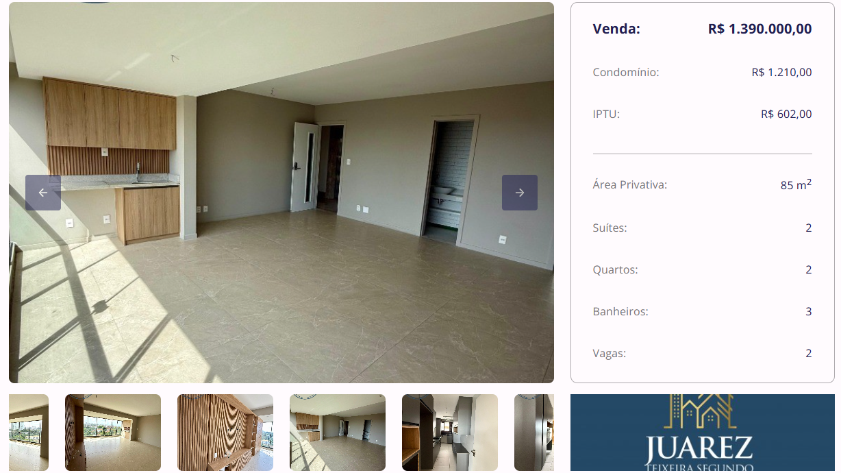 Um dos imóveis disponíveis é um apartamento de 85 m², no Horto Florestal, O imóvel conta com 2 suítes, lavabo, banheiro de serviço, sala ampla e integrada, cozinha com armários planejados, andar alto, posição nascente e excelente ventilação natural. Possui 85 m² de área privativa, depósito e 2 vagas de garagem soltas. Localizado no condomínio Terrazzo Santa Luzia, no Horto Florestal, com infraestrutura completa de lazer e segurança, incluindo portaria 24h, mini quadra, sala de jogos com brinquedoteca, piscina, espaço gourmet, salão de festas e academia.