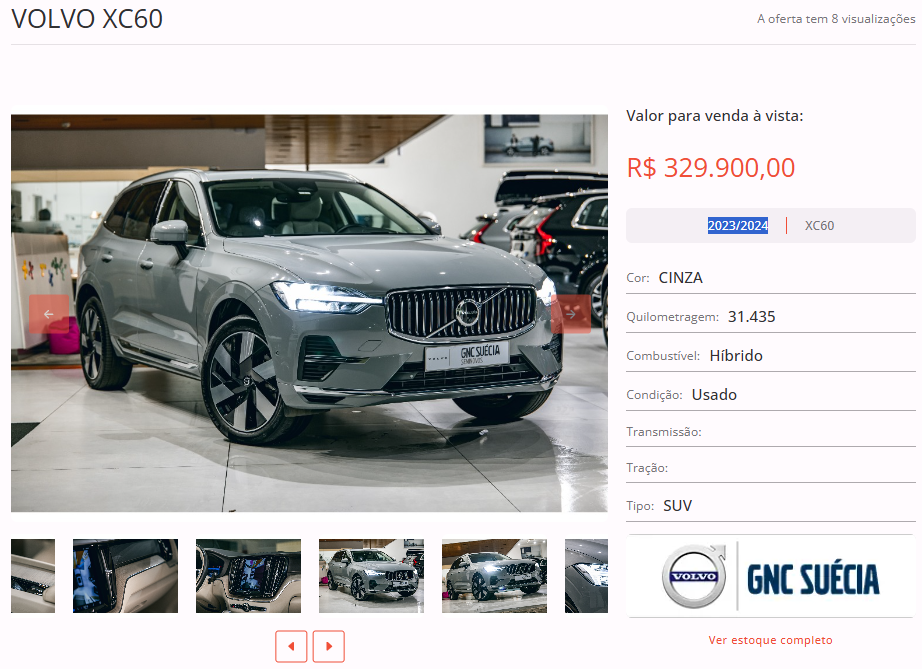 Entre as opções disponíveis em nosso site, está um VOLVO XC60, cor cinza, ano 2023/2024, na loja Volvo Cars GNC Suécia. Todas as informações de contato estão disponíveis na nossa plataforma.